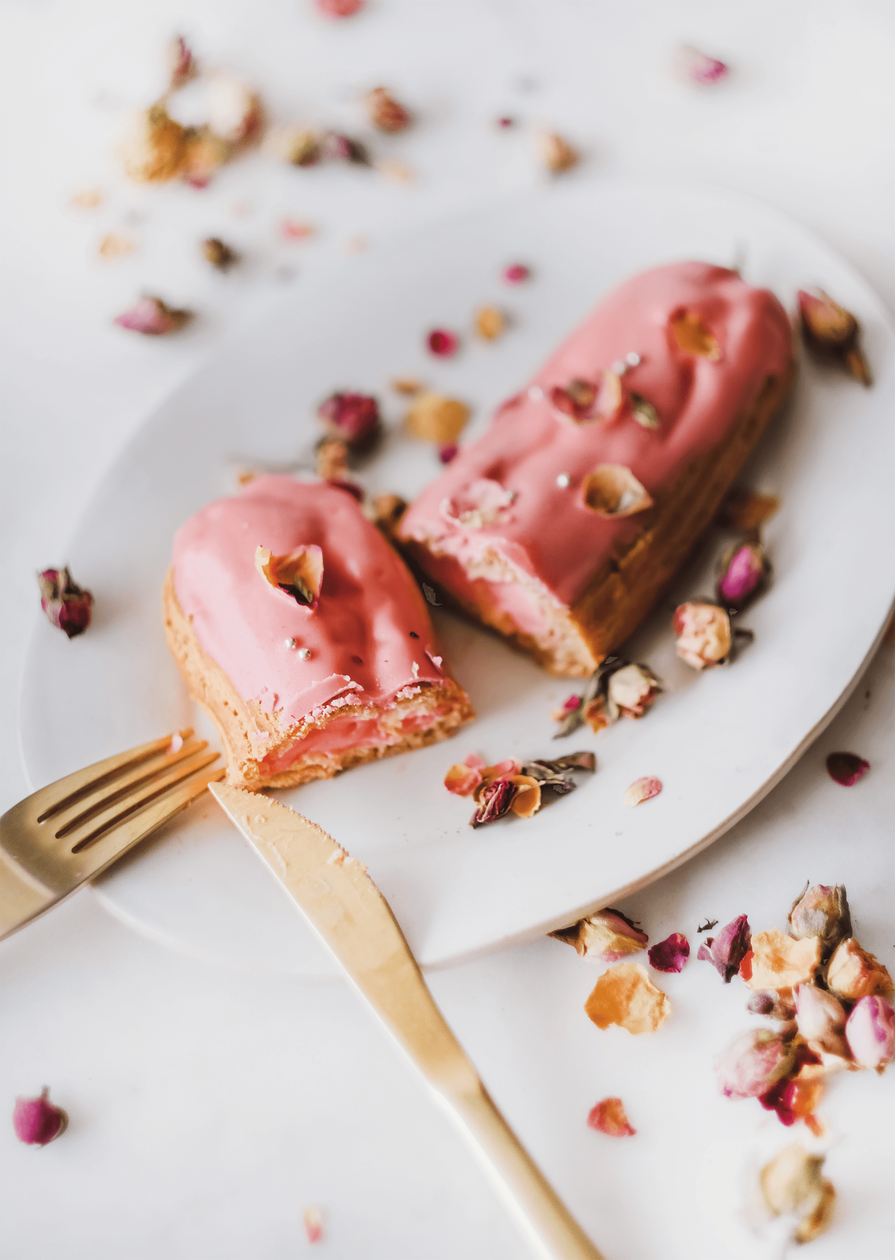 Filled with silky rose-infused cream and glazed with a delicate rose icing
