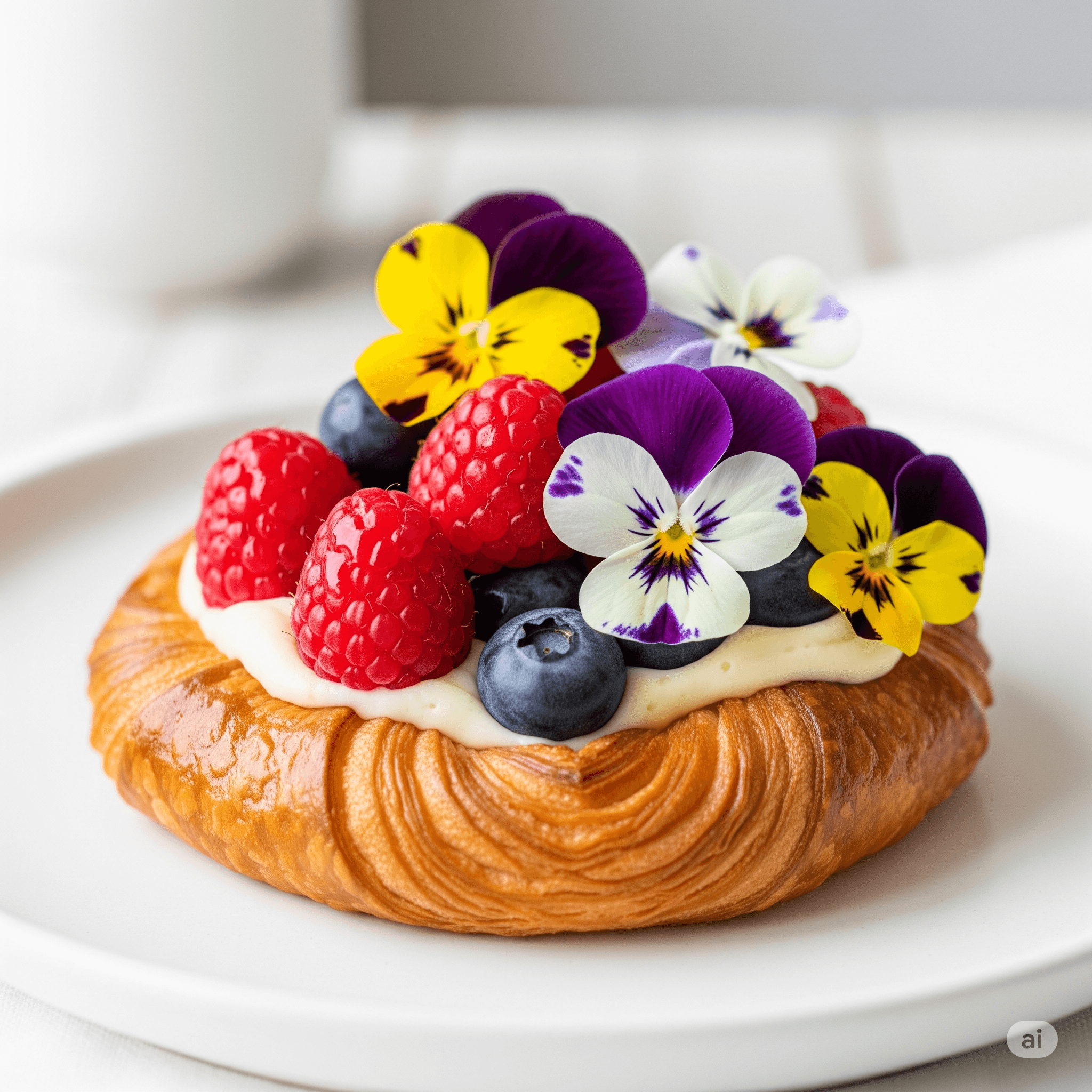 Flaky danish with sweet berries, topped with fresh viola petals.
